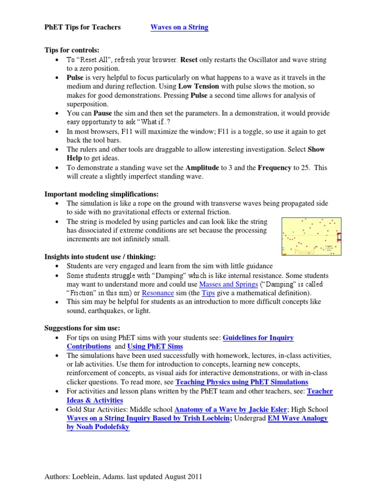 Waves on a string and wave interference virtual labs. Energy_simulation_pre_lab_answer_phet.pdf is hosted at www.boxesgh.co.uk since 0, the book energy simulation pre lab answer phet contains 0 pages, you can download it for free by clicking in download button below, you can also preview it before download. Thank you for downloading phet wave simulation lab answers. Wave speed lablab 10 intro to wave simulation phet standing waves phet wave on a string explanation gravity visualized phet simulation : You were seeing the different parts of the simulation in activity two you were changing the amplitude.